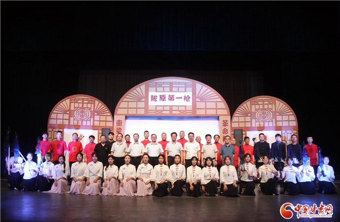 《隴原第一槍》全劇分希望、播火、誆宴、奪槍、功捷5場,演出團隊分為前臺演唱組、樂隊伴奏組、影人挑纖組、嘛簧幫唱組,演職人員中有國家級非遺代表性傳承人2人,省級非遺代表性傳承人2人,市級、縣級代表性傳承人近10人,加上隴東音樂學院學生共50人參與了演出。