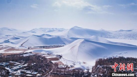 11月20日凌晨,甘肅敦煌降下2021年入冬以來(lái)的第一場(chǎng)雪。當(dāng)日上午10時(shí)左右,敦煌大漠雪后天氣放晴,被白雪覆蓋著的大漠山川銀裝素裹顯得分外妖嬈,遠(yuǎn)遠(yuǎn)望去鳴沙山白雪茫茫,沙雪交融,美景如畫,呈現(xiàn)出難得一見的北方雪國(guó)風(fēng)情。
