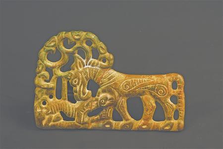 受草原文化影響,虎的造型更具藝術(shù)性,形式亦豐富多彩。甘肅省博物館藏的西周虎紋耳形銅鉞,整體似半環(huán),鑄猛虎紋,虎背為刃。尾下有短胡兩穿,尾、雙爪上鑄凹槽,虎首下彎,張口含銎,露牙睜目,領(lǐng)內(nèi)有一圓形穿孔。甘肅省文物考古研究所藏的戰(zhàn)國(guó)金帶鉤,鉤首為長(zhǎng)頸龍首狀,頸部為三棱狀,肩部三角形邊框內(nèi)鏤空雕鑄對(duì)稱和狼形圖案。鉤身為長(zhǎng)方形,邊框內(nèi)鏤空雕刻一組正反相對(duì)稱的虎噬大角羊圖案。張家川回族自治縣博物館藏的戰(zhàn)國(guó)晚期的虎形金飾片,虎尖耳上翹,大嘴張開,鬃毛卷曲上翹,尾前卷于背部與鬃毛相連,四足著地做行走狀,栩栩如生地展現(xiàn)了虎行走的動(dòng)感之態(tài)。甘肅省博物館藏的戰(zhàn)國(guó)虎噬羊紋金飾片,虎張口露齒,垂首蹲踞,虎口銜羊,前爪按住羊肩部,后爪抓住羊臀部,羊四肢跪地作掙扎狀,活靈活現(xiàn)地展現(xiàn)出猛虎捕食羊的瞬間動(dòng)態(tài),形象逼真。這些虎文物都是此次展覽中的亮點(diǎn)。