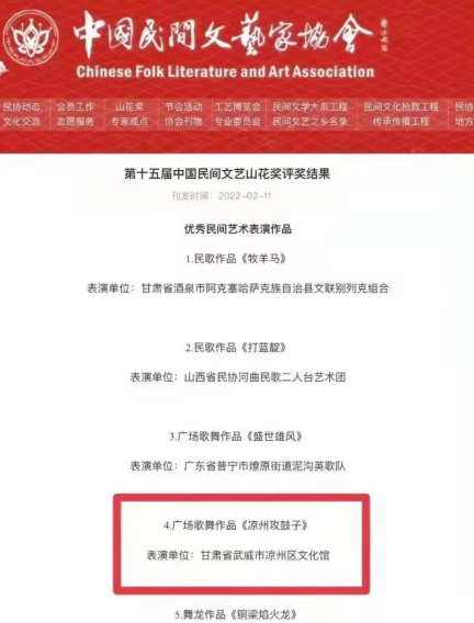 《涼州攻鼓子》榮獲第十五屆中國民間文藝山花獎(jiǎng)