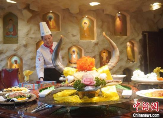 位于蘭州主城區(qū)一家名為“敦煌盛宴”的餐廳內,模仿莫高窟洞窟外形裝修,繪飾敦煌壁畫,如此讓食客身臨其境。“九色鹿”“月牙泉”“絲路駝鈴”和“敦煌舞袖湯”等包含敦煌元素的古代佳肴悉數(shù)被端上餐桌。