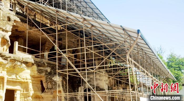 在北石窟寺,多體量多結(jié)構(gòu)腳手架支撐起保護棚,窟龕輪廓若隱若現(xiàn)。崔惠萍介紹說,該防水工程,屬于實驗性,于2021年3月建成,能最大程度覆蓋遮擋崖體,保護崖面窟龕,防止雨水對石窟的沖蝕破壞。