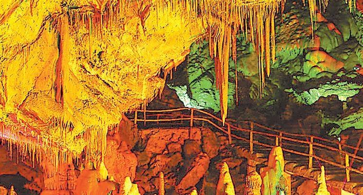 邊走邊看,巨大的石筍、石柱巍然聳立,站在“大廳”中央天然形成的小石橋往下看,橋下一片天然池水。走近邊池,走上小石橋,站在橋上看風(fēng)景。依托這些形態(tài)各異的鐘乳石,在不同明暗色彩的燈光照射下,給這些原本就讓人目瞪口呆的景致更加增添了夢幻色彩。