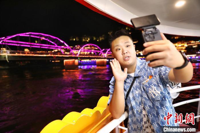 7月16日,“絲路風采 如意甘肅”海峽兩岸記者聯(lián)合采訪活動在甘肅蘭州啟動。圖為臺灣自媒體人林惟綱在“黃河第一橋”——中山橋下拍攝短視頻。 中新社記者 李雪峰 攝