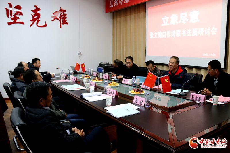 11月26日下午,“立象盡意——張文翰自作詩(shī)聯(lián)書法展研討會(huì)”在華夏文明導(dǎo)報(bào)社舉行。甘肅省委宣傳部文藝處處長(zhǎng)李樂(lè),中國(guó)作家協(xié)會(huì)會(huì)員、甘肅省作家協(xié)會(huì)副主席牛慶國(guó),中國(guó)書法家協(xié)會(huì)會(huì)員,甘肅省書法家協(xié)會(huì)副主席張萬(wàn)勝出席研討會(huì),來(lái)自蘭州大學(xué)、西北師范大學(xué)的教授、學(xué)者20余人參加會(huì)議。