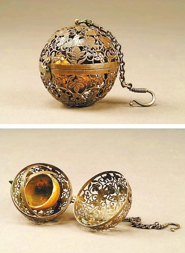 香囊最出彩的地方是機環(huán)常平架技術(shù),是一種利用球體內(nèi)兩個同心機環(huán)與中央焚香盂之間的重力作用,使其在自由轉(zhuǎn)動的時候,始終能保持平衡的機械原理。唐代的香囊豐富多樣,這種金屬造型的香囊設(shè)計更為機巧精致,深受妃后、貴婦們所推崇喜愛,它上承漢代的常平架技術(shù),下延現(xiàn)代陀螺儀萬向支架技術(shù),是中國古代科學(xué)技術(shù)與手工藝技術(shù)對世界的杰出貢獻。