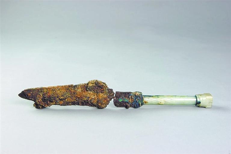 玉柄鐵劍出土于河南三門峽虢國國君虢季的墓葬,全長34.2厘米,其中劍柄長12.2厘米,劍身長22厘米。劍柄為銅芯,起到連接劍柄和劍身的作用,銅芯外鑲有晶瑩透亮的和田美玉和綠松石,并有精美的竹節(jié)飾紋,劍身和劍柄的結(jié)合處也鑲有綠松石。劍身經(jīng)由北京科技大學(xué)冶金與材料史研究所鑒定,是由塊煉法鍛制而成,劍身外有絲織品包裹的痕跡,應(yīng)當是被絲織品包裹后放入劍鞘。劍鞘則由牛皮精制而成。這把玉柄鐵劍不僅制作精美,而且其利用玉、銅、鐵三種材料制作而成,是我國目前考古發(fā)掘出土的年代最早的人工冶鐵制品。它將我國的人工冶鐵歷史推前了近兩個世紀,被專家們譽為“中華第一劍”。