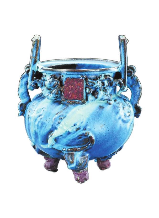 香爐整體造型為雙立耳,圓鼓腹,三獸足,體形較大。頸部雕貼三只麒麟,正面有一初方形題記,刻有“己酉年九月十五小宋自造香爐一個”共計15字,經(jīng)考證:“己酉年”是公元1309年,屬于元代中期。香爐通體施天青色釉,釉層較厚,在高溫中由于積釉濃淡不一,縱橫流淌到器表各處,形成天青、天藍、灰藍等不同釉面,再與紅褐色的露胎對比,有了銅器般的金屬質(zhì)感。
