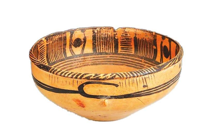 這件距今5000多年的古代彩陶作品,制作精致,圖案精美,人物形體鮮明,造型和動作既抽象又生動。彩陶盆通高11.3厘米,口徑24.5厘米,底徑9.8厘米,細泥制作,唇外侈,略鼓腹,腹部兩側(cè)有對稱的小鈕。口沿內(nèi)壁為四組雙人抬物圖案,中間以橫豎線條組成的幾何圖案間隔,形成一周四方連續(xù)的紋飾帶,繪制于陶盆內(nèi)側(cè)上部,二人的頭部以圓點代表,軀干和四肢以線條描繪。兩人相向站立,共同抬起一個碩大的圓形物體,畫面簡潔而生動,寥寥數(shù)筆就將人抬重物時雙腿開立、腰背微屈用力的形態(tài)刻畫得惟妙惟肖。陶盆上精妙的紋飾讓它成為我國最早在彩陶上表現(xiàn)原始先民勞作場景的藝術(shù)珍品。