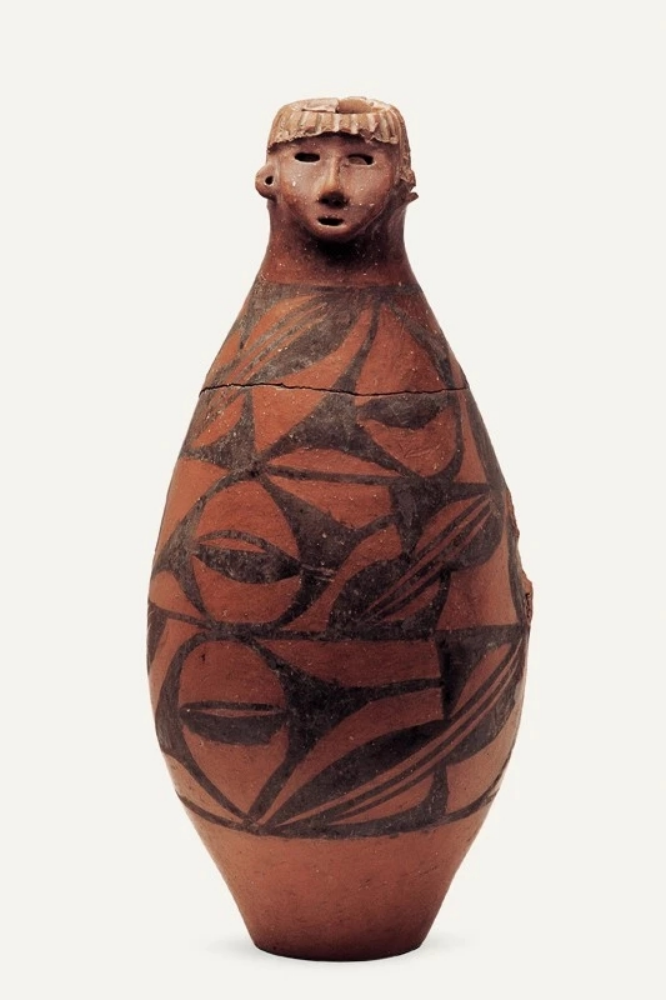 隴東少女作為甘肅的“顯眼包”之一,是曾在《國家寶藏》中出現(xiàn)過的“網(wǎng)紅”、甘肅省博物館鎮(zhèn)館之寶,它于1973年從秦安縣大地灣遺址出土。具有高度審美能力的“托尼”老師,設(shè)計了齊劉海發(fā)型,顯得很泰酷辣,圓鼓腹、平底,人們細看發(fā)現(xiàn),陶人的兩眼為圓孔洞,顯得目光深邃;鼻子呈蒜頭形,雕有鼻孔;嘴較小,微微張開,好像正在言語;兩耳外展,皆有穿孔;瓶體從上至下以黑彩飾三層大小相同、由弧線三角紋和斜線組成的二方連續(xù)圖案,以示華麗的衣物。另外,陶瓶人頭像的器口運用了不同的制作手法,頭發(fā)、嘴系雕刻而成,鼻、臉是捏塑而成。人頭像五官整齊、面龐秀麗,器身造型典雅,與人物形象渾然一體,既是大地灣文化彩陶的代表作,也是中國史前集彩繪、雕塑與造型藝術(shù)于一身的杰作。估計任誰看一眼,都會被“她”的神秘和美麗所吸引吧。