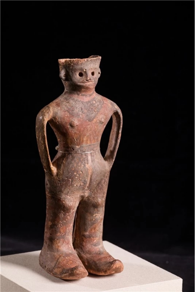 “河西少年”——人形彩陶罐出土于火燒溝遺址,國家一級珍貴文物, 1990年作為甘肅省選送的8件精品文物之一在舉辦第十一屆北京亞運會期間向中外游客展出。遠看是一名雙手插兜站立的酷少年,其體 態(tài)、動作和神情刻畫得栩栩如生;走近一看,人像短發(fā)、高鼻深目、雙耳開孔、表情生動,其身 著短上衣,頸部至胸前的網(wǎng)格紋就像是戴有精美的項飾,下身著網(wǎng)格長褲裙,雙手插在褲兜里, 碩大的雙腳上穿著肥大的高腰靴子,一副怡然自得的樣子。陶罐人體中空,可以盛水, 插入褲兜的雙臂形成陶罐的雙耳,設(shè)計大膽,制作精巧。2023年玉門市博物館參加的騰訊探元文化創(chuàng)新大賽“古物換新樣”中,“河西少年”成為追捧的對象,在眾多參賽作品中脫穎而出,被很多設(shè)計師設(shè)計成了背包、花盆、臺燈、盲盒等文創(chuàng)產(chǎn)品。