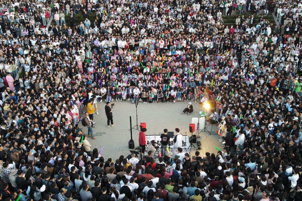 4月26日,游客在蘭州黃河食渡文旅美食街觀看演出。新華社記者 郎兵兵 攝