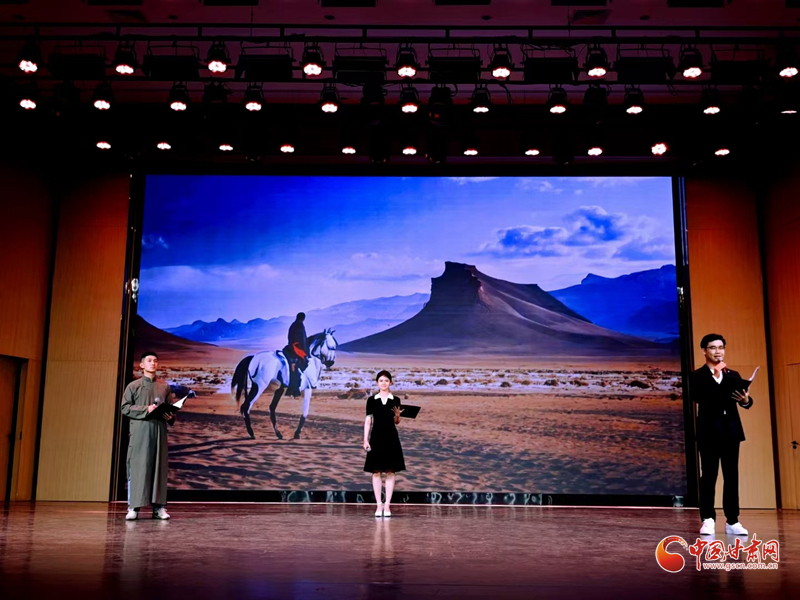 詩朗誦環(huán)節(jié)選取了著名詩人昌耀的《在敦煌名勝地聽駝鈴尋唐夢》、葉舟的《大唐西域記》、汪小平的《蘭州、別樣的城市》以及項目主持人徐兆壽的《尋找昆侖》《敦煌之光》等。這些作品都取材自絲綢之路,學員們以詩歌朗誦的形式,抒發(fā)了詩人對絲綢之路的贊美之情,展現(xiàn)了絲綢之路的壯麗景色和豐厚的歷史文化內(nèi)涵,仿佛令人置身于充滿傳奇色彩的古道。最后,全體學員與舞蹈演員合唱歌曲《等你在涼州》,將演出推向了高潮。