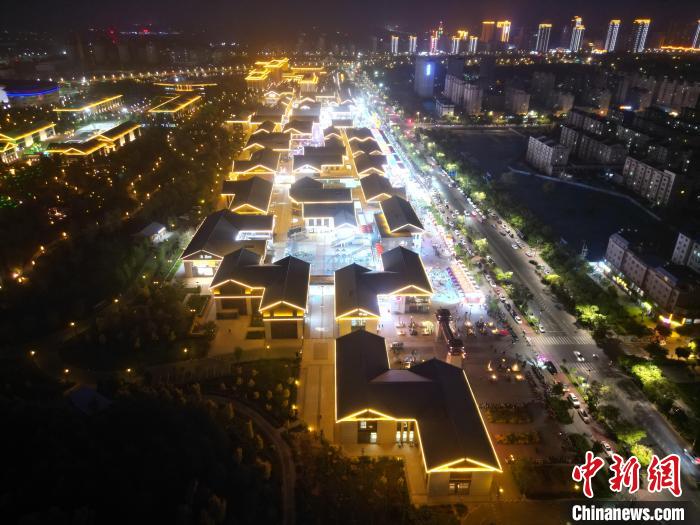 圖為明清街夜市燈光點(diǎn)亮具有武威文化元素的“天梯山石窟”彩燈。(無人機(jī)照片)  戴文昌 攝