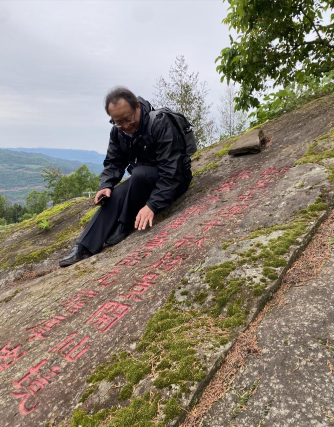 山上隨處是石,或臥或立,俱有雄獅虎豹之勢;或平或峻,皆作岡陵之態(tài)。青峰續(xù)脈,絕頂鷹飛。鑿巖壁以造法像,栩栩如臨宮闕;摩巨石而鐫嘉聯(lián),文華直射牛斗。石多瑰偉,苔覆璞瑜,油菜花點(diǎn)綴其間,引來蜜蜂蝴蝶共舞。山茶與毛竹同畦,郁郁蔥蔥;峰巒與云煙共養(yǎng),莽莽蒼蒼。遇目石上鐫字,瀏賞翰墨煙霞;振藻揚(yáng)毫,皆寰中俊杰;椽筆斯文,多隴蜀賢達(dá)?;虺嘧痈文懀瑺T照于史;或凜然浩氣,嘯傲大千。聯(lián)壁生輝,文曲星彰;峣巖開竅,氣通神明。文采煥然與星河同輝,詩儕競秀潤厚山玉顏。壯懷詩夢,漱玉溪流。在一塊巨石斜面上,有同伴發(fā)現(xiàn)刻有筆者所書長聯(lián),興奮得喊叫起來。這是三年前應(yīng)曹興章先生之約而作,聯(lián)曰:翰墨生輝,千秋勝景開仙境;源泉流韻,萬象韶光耀厚山。我用手指扣去筆畫生出的茂密青苔,坐下來與我的聯(lián)合影留念。信是蓮花開石上,遙遙至此結(jié)仙緣。