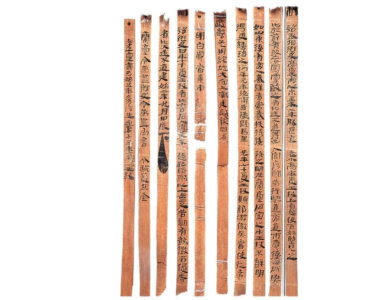 王杖簡(jiǎn),漢代,出土于武威市磨咀子漢墓。共計(jì)10枚,松木削制。兩道編繩,先書后編;墨書隸體,字跡清晰。每枚簡(jiǎn)容字多者37字,少者6字,共240字。其內(nèi)容記載了東漢永平十五年(72年)幼伯受王杖事,并錄建始二年(前31年)九月“年七十受王杖”的詔書與河平元年(前28年)毆擊王杖主當(dāng)棄市的令。