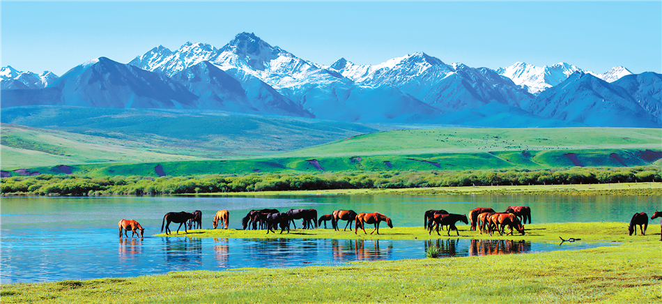 白雪皚皚的祁連山下,一眼望不到邊的大片牧草青翠碧綠,色彩斑斕的野花競相開放,擁有百萬畝草原的山丹馬場如巨幅彩色畫卷徐徐展開。