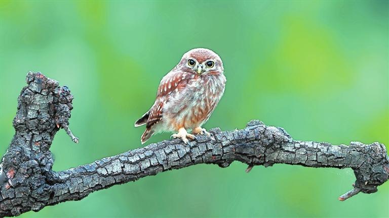 我近距離地看著這小小的、聰慧的鳥兒。它的上體是棕黃色的,散布著許多白點,頭上的白點比身上的更加細(xì)密。貓頭鷹脖子的轉(zhuǎn)動極限大約是270度,能水平轉(zhuǎn),也能上下轉(zhuǎn),這個“超能力”讓眼前的小家伙能更靈活機(jī)敏地打量我。它的眼周有一圈兒顯眼的白色,于喙的上方幾乎相連,變成兩道白色的眉毛,平添了幾分威武。