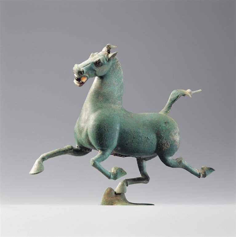 銅奔馬,東漢,1969年武威市雷臺墓出土。馬作奔騰狀,三足騰空,右后蹄踏一展翅飛翔、回首驚顧的飛鳥。奔馬全身著力點(diǎn)集于超掠飛鳥的一足之上,準(zhǔn)確地把握了力學(xué)平衡。蹄踏飛鳥,表現(xiàn)出馬行迅疾,在鳥驚回首的剎那已經(jīng)超越了飛行的鳥。銅奔馬鑄造精美,構(gòu)思巧妙,為我國青銅藝術(shù)中罕見的杰作,1983年被確定為中國旅游標(biāo)志,2002年被國家文物局列入首批禁止出國(境)展覽文物目錄。它以卓絕的藝術(shù)造詣千古生輝,成為中華民族勇往直前、積極進(jìn)取偉大氣質(zhì)的象征。