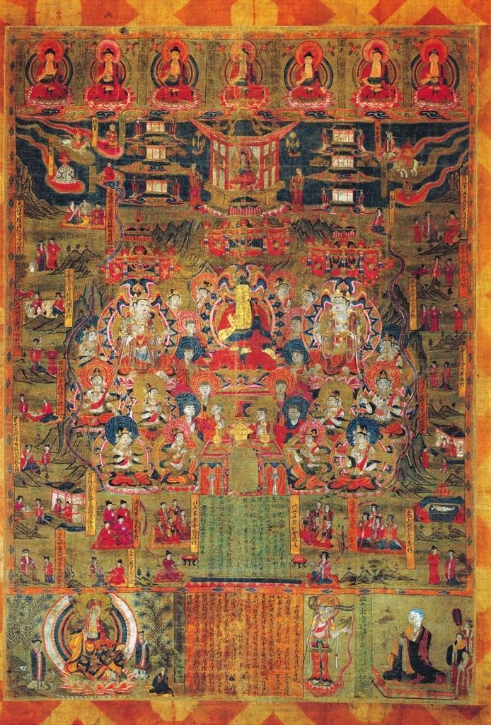 該畫為絹地設(shè)色,出自敦煌莫高窟藏經(jīng)洞。畫面中心為說法圖,一佛二菩薩法相莊嚴(yán),諸菩薩、弟子、比丘、比丘尼、優(yōu)婆塞、優(yōu)婆夷等“赴會圣眾”圍繞周圍。兩側(cè)及上方分布15幅經(jīng)變故事圖,以連環(huán)畫形式鋪陳展現(xiàn)《佛說父母恩重經(jīng)》的基本內(nèi)容。其上繪七佛、彌勒與七寶,其下墨書《佛說報父母恩重經(jīng)變》。絹畫最下方自左向右排布地藏菩薩、《繪佛邈真紀(jì)》、引路菩薩及比丘尼戒行邈真像。該絹畫保存完整,色彩絢麗,是敦煌《佛說父母恩重經(jīng)》諸變相中,內(nèi)容最復(fù)雜,畫面情節(jié)最多,特點(diǎn)最鮮明,風(fēng)格最獨(dú)特的一幅,且有宋淳化二年(公元991年)明確紀(jì)年,具有重要的歷史、藝術(shù)和研究價值。