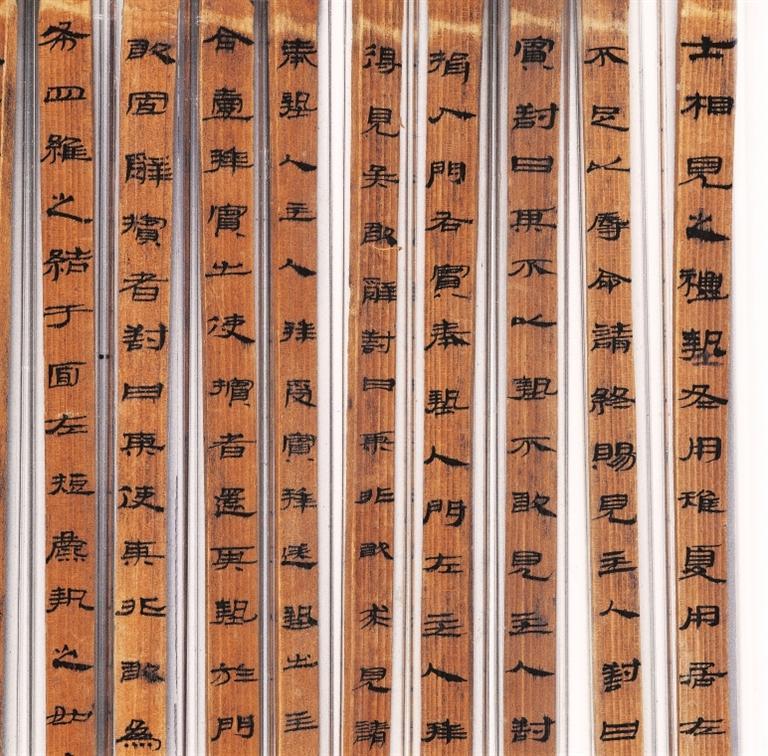 《儀禮》簡,西漢,武威磨嘴子出土。分木質(zhì)和竹質(zhì)兩種,共496枚,編為甲、乙、丙三本,系先編后寫。甲本為《儀禮》17篇中的7篇,乙本僅存《服傳》一篇,丙本僅存《喪服》一篇。該簡冊保存基本完好,與傳世的鄭玄注本不同,應(yīng)是目前所見《儀禮》的最古寫本,在版本??鄙嫌泻芨叩膬r值,且書寫工整秀麗,是漢代墨寫隸書的上品。