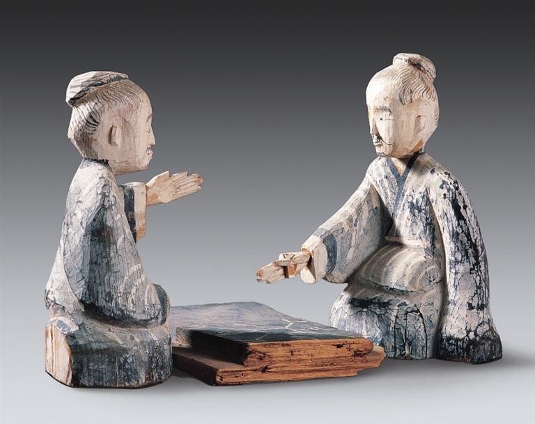 彩繪木六博俑,西漢,武威磨嘴子出土。木俑為兩位跪坐對局的老者形象,二者間設(shè)一長方形棋盤。老者神情凝滯,蓄勢待發(fā),顯然正在緊張的六博對局之中??脊虐l(fā)現(xiàn)中不乏漢代博局、棋子、骰子等六博器具,漢墓畫像磚中也常見相關(guān)圖像,但以雕塑刻畫六博對局卻極為罕見,這件文物充分體現(xiàn)了漢代木雕藝術(shù)所達(dá)到的高度與境界。