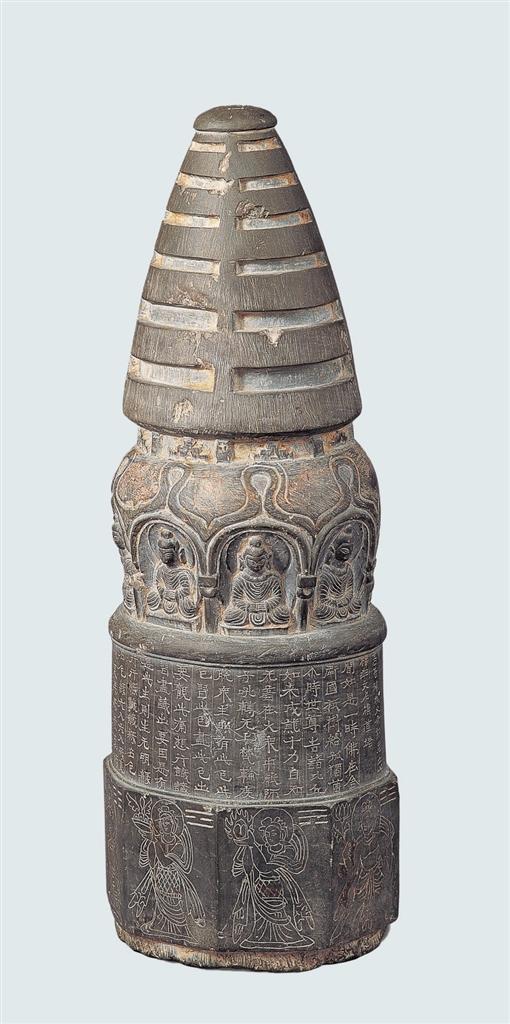 高善穆石造像塔,1969年甘肅省酒泉市出土。寶蓋、相輪、塔頸、塔肩、塔基一應(yīng)俱全,底部有榫頭。寶蓋頂端中間刻北斗七星,塔腹陰刻《增一阿含經(jīng)·結(jié)禁品》的前半部分及發(fā)愿文,有承玄元年(公元428年)紀(jì)年。塔基為八面形,每面陰刻一像,像左側(cè)上方刻八卦符號。該造像塔是現(xiàn)存北涼石塔中保存最完整的一件,在造型上繼承了犍陀羅供養(yǎng)小塔的基本造型特征,又有了新的發(fā)展,如塔頂端的北斗七星,塔基的八卦符號等,體現(xiàn)出佛教文化和中國本土文化之間的碰撞和融合,是研究早期佛教藝術(shù)和佛教思想的重要標(biāo)本。