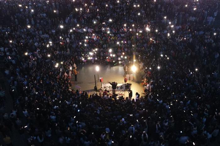 在蘭州市城關(guān)區(qū)的黃河蘭州段近水平臺(tái),市民及游客參與“蘭州黃河大合唱”活動(dòng)。新華社記者 范培珅 攝