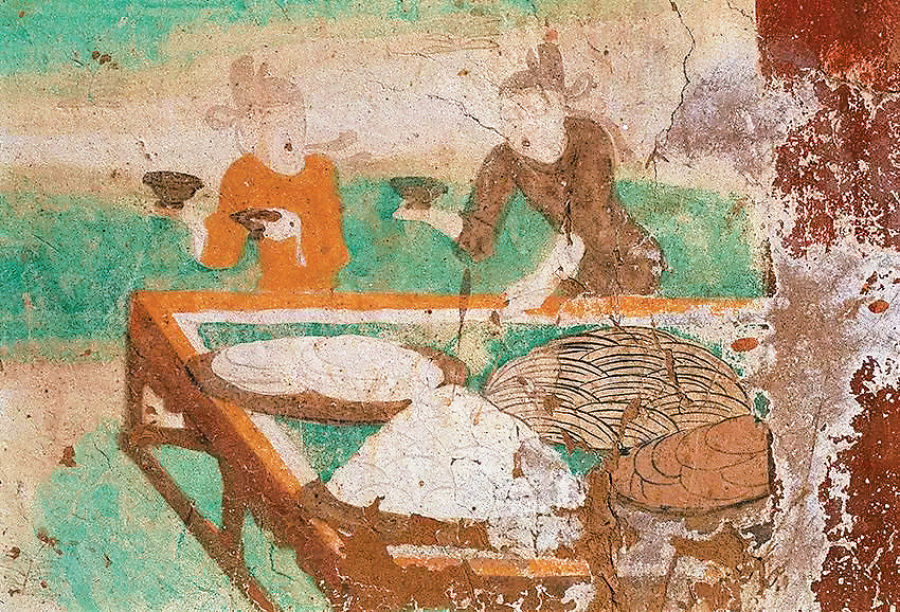 風(fēng)干饃,是敦煌流傳至今仍然很流行的一種民間吃法,今天的敦煌人將它同西瓜巧妙地搭配,開發(fā)出了風(fēng)干饃饃泡西瓜的別樣吃法。敦煌壁畫中繪制有許多“甑”和“蒸籠”的形象,蒸籠主要用于蒸饅頭,而“甑”則是“蒸籠”的早期形式,同時,在榆林窟第25窟,雪白的饅頭(蒸餅)周圍布滿了菜品,說明饅頭在當(dāng)時已成為餐桌上必備的主食之一。其實,在古代敦煌,饅頭(蒸餅)是餐桌上較為高級的食品,主要原因就是它是用細面(白面)制作而成,是一種超脫日常生活的食品,多用在婚宴和供奉這樣的特殊場合。如榆林窟第25窟的婚宴圖中,饅頭的形象十分突出;除此之外,莫高窟第61窟香客遠赴五臺山的進香圖中的貢品饅頭;莫高窟第236窟中的供養(yǎng)圖中的饅頭;莫高窟第154窟供養(yǎng)齋僧圖中的饅頭形象,無不顯示出敦煌古代饅頭(蒸餅)的珍貴。