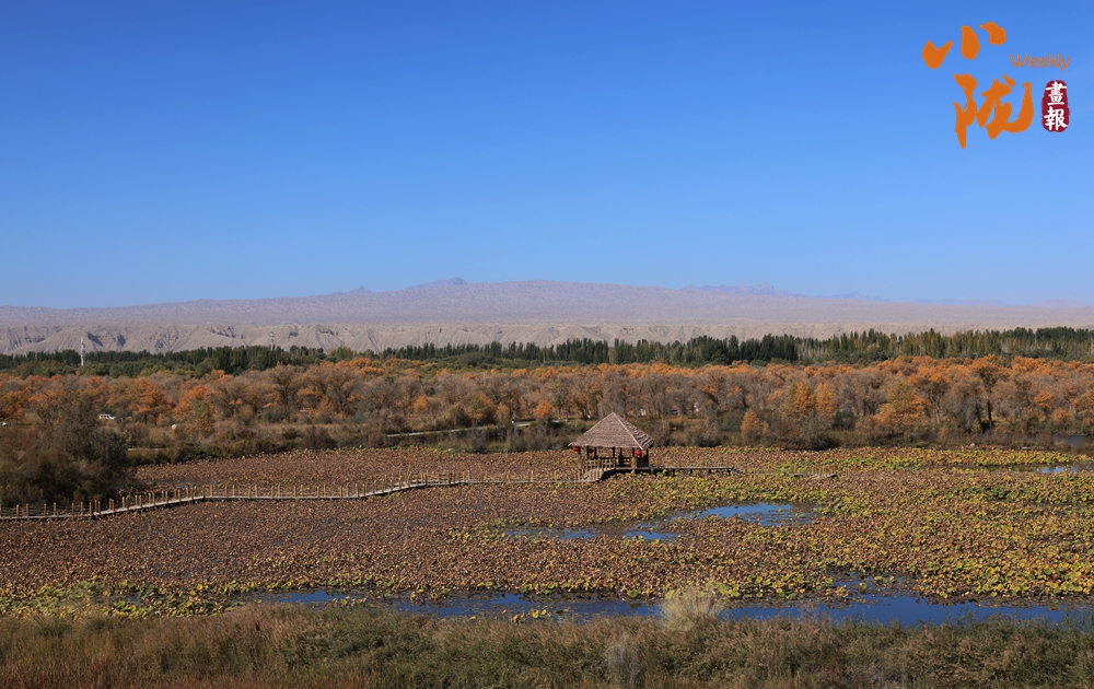 一大片荷花池,因為是深秋,池內(nèi)的荷葉已經(jīng)枯萎,變成金黃色,與周邊的金胡楊相映成趣。蒼勁的胡楊,高雅的荷花在此結(jié)緣。葦草繁茂,野花盛開,置身其中,仿佛走進(jìn)金色的海洋。