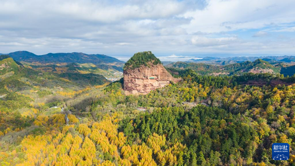 這是11月2日拍攝的麥積山石窟秋景(無(wú)人機(jī)照片)。新華社記者 陳斌 攝