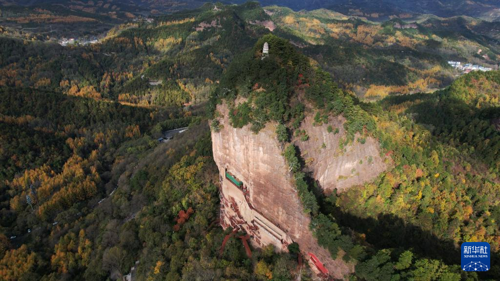 這是11月2日拍攝的麥積山石窟秋景(無(wú)人機(jī)照片)。新華社記者 郎兵兵 攝