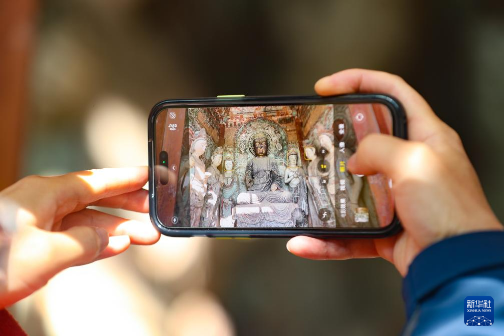 11月2日,游客在麥積山石窟參觀游覽時(shí)用手機(jī)拍攝開(kāi)放洞窟彩塑。新華社記者 郎兵兵 攝
