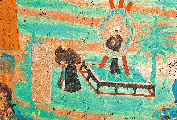 戰(zhàn)國時期楚國詩人屈原在《漁父》一文中寫道:“吾聞之,新沐者必彈冠,新浴者必振衣。安能以身之察察,受物之汶汶者乎?”意思是說我聽說剛洗過頭的人一定會去彈彈帽子上的灰塵;剛洗過澡的人一定要抖抖衣服的灰塵。怎能讓清白的身體去接觸世俗塵埃的污染呢?當(dāng)年的敦煌人走出溫泉,在身心放松之后,就該靜觀返照自己了。在莫高窟第85窟中有一幅“曲花式鏡圖”:畫面上在一個正方形鏤空的底座上擺放著一個巨大的曲花式鏡,鏡子式樣別致,明亮澄澈。藍(lán)色的曲花式樣引人矚目。但畫面上最吸睛的是一位魁梧俊朗身著一襲赭色長袍的男子,他正在鏡子前仔細(xì)地打量自己,而鏡中映射出他神情凝重的情態(tài)來。原來,古人照鏡除了正衣冠之外,還有反觀自照的含義,在鏡子前良久地注視自己,就是對自己反省、頓悟的過程。“一年好景君須記”,走過四季,到了歲末,該是每個人回望來時路,展望前方的時候了。