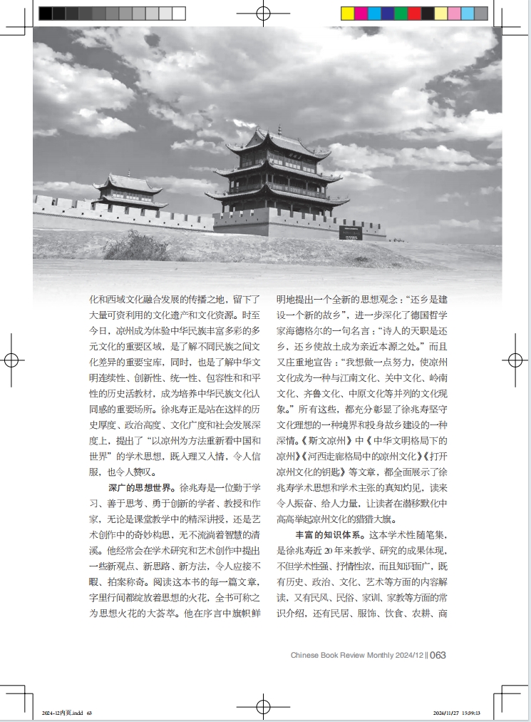 深廣的思想世界。徐兆壽是一位勤于學(xué)習(xí)、善于思考、勇于創(chuàng)新的學(xué)者、教授和作家,無(wú)論是課堂教學(xué)中的精深講授,還是藝術(shù)創(chuàng)作中的奇妙構(gòu)思,無(wú)不流淌著智慧的清溪。他經(jīng)常會(huì)在學(xué)術(shù)研究和藝術(shù)創(chuàng)作中提出一些新觀點(diǎn)、新思路、新方法,令人應(yīng)接不暇、拍案稱奇。閱讀這本書的每一篇文章,字里行間都綻放著思想的火花,全書可稱之為思想火花的大薈萃。他在序言中旗幟鮮明地提出一個(gè)全新的思想觀念 :“還鄉(xiāng)是建設(shè)一個(gè)新的故鄉(xiāng)”,進(jìn)一步深化了德國(guó)哲學(xué)家海德格爾的一句名言 :“詩(shī)人的天職是還鄉(xiāng),還鄉(xiāng)使故土成為親近本源之處。”而且又莊重地宣告 :“我想做一點(diǎn)努力,使涼州文化成為一種與江南文化、關(guān)中文化、嶺南文化、齊魯文化、中原文化等并列的文化現(xiàn)象。”所有這些,都充分彰顯了徐兆壽堅(jiān)守文化理想的一種境界和投身故鄉(xiāng)建設(shè)的一種深情?!端刮臎鲋荨分小吨腥A文明格局下的涼州》《河西走廊格局中的涼州文化》《打開涼州文化的鑰匙》等文章,都全面展示了徐兆壽學(xué)術(shù)思想和學(xué)術(shù)主張的真知灼見,讀來(lái)令人振奮、給人力量,讓讀者在潛移默化中高高舉起涼州文化的獵獵大旗。