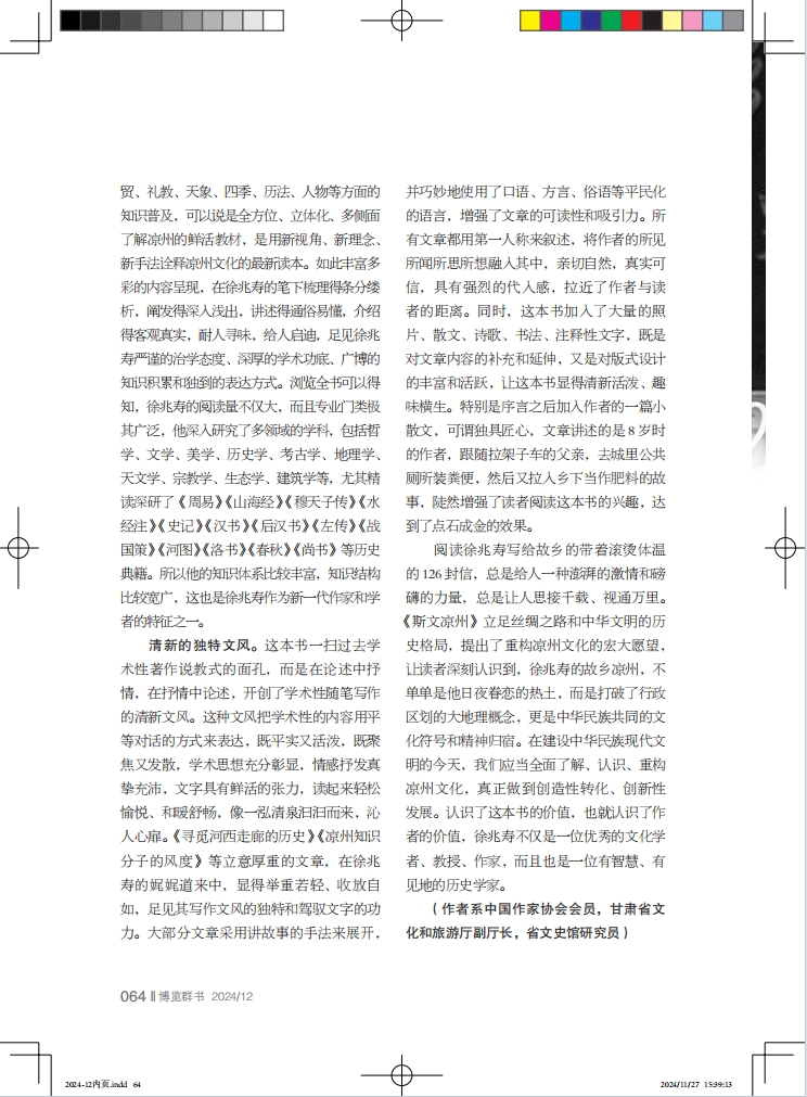 豐富的知識(shí)體系。這本學(xué)術(shù)性隨筆集,是徐兆壽近20年來(lái)教學(xué)、研究的成果體現(xiàn),不但學(xué)術(shù)性強(qiáng)、抒情性濃,而且知識(shí)面廣,既有歷史、政治、文化、藝術(shù)等方面的內(nèi)容解讀,又有民風(fēng)、民俗、家訓(xùn)、家教等方面的常識(shí)介紹,還有民居、服飾、飲食、農(nóng)耕、商貿(mào)、禮教、天象、四季、歷法、人物等方面的知識(shí)普及,可以說(shuō)是全方位、立體化、多側(cè)面了解涼州的鮮活教材,是用新視角、新理念、新手法詮釋涼州文化的最新讀本。如此豐富多彩的內(nèi)容呈現(xiàn),在徐兆壽的筆下梳理得條分縷析,闡發(fā)得深入淺出,講述得通俗易懂,介紹得客觀真實(shí),耐人尋味,給人啟迪,足見徐兆壽嚴(yán)謹(jǐn)?shù)闹螌W(xué)態(tài)度、深厚的學(xué)術(shù)功底、廣博的知識(shí)積累和獨(dú)到的表達(dá)方式。瀏覽全書可以得知,徐兆壽的閱讀量不僅大,而且專業(yè)門類極其廣泛,他深入研究了多領(lǐng)域的學(xué)科,包括哲學(xué)、文學(xué)、美學(xué)、歷史學(xué)、考古學(xué)、地理學(xué)、天文學(xué)、宗教學(xué)、生態(tài)學(xué)、建筑學(xué)等,尤其精讀深研了《周易》《山海經(jīng)》《穆天子傳》《水經(jīng)注》《史記》《漢書》《后漢書》《左傳》《戰(zhàn)國(guó)策》《河圖》《洛書》《春秋》《尚書》等歷史典籍。所以他的知識(shí)體系比較豐富,知識(shí)結(jié)構(gòu)比較寬廣,這也是徐兆壽作為新一代作家和學(xué)者的特征之一。