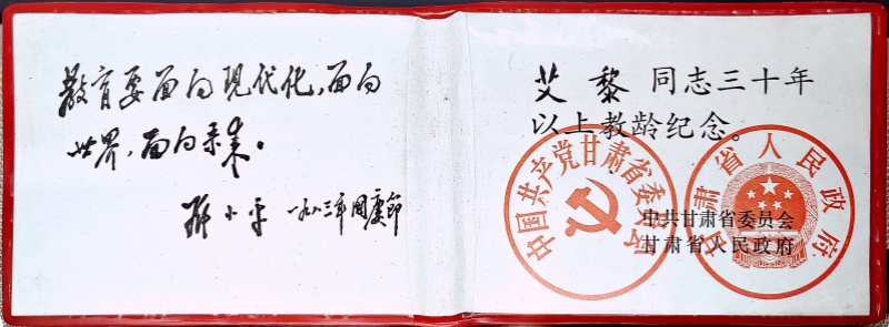 這是一本從教滿三十年的榮譽(yù)證書。由中共甘肅省委、甘肅省人民政府頒發(fā)。證書內(nèi)頁(yè)的左側(cè)是鄧小平1983年國(guó)慶節(jié)題寫的“教育要面向現(xiàn)代化,面向世界,面向未來”。右側(cè)是“艾黎同志三十年以上教齡紀(jì)念”。“三個(gè)面向”是為北京景山學(xué)校的題詞,是鄧小平提出的教育發(fā)展改革方針,旨在推動(dòng)中國(guó)的教育現(xiàn)代化進(jìn)程,使其更加開放和適應(yīng)未來發(fā)展的需要,面向世界,吸收國(guó)際先進(jìn)的教育理念和經(jīng)驗(yàn);同時(shí)展望未來,培養(yǎng)適應(yīng)未來社會(huì)需要的人才。