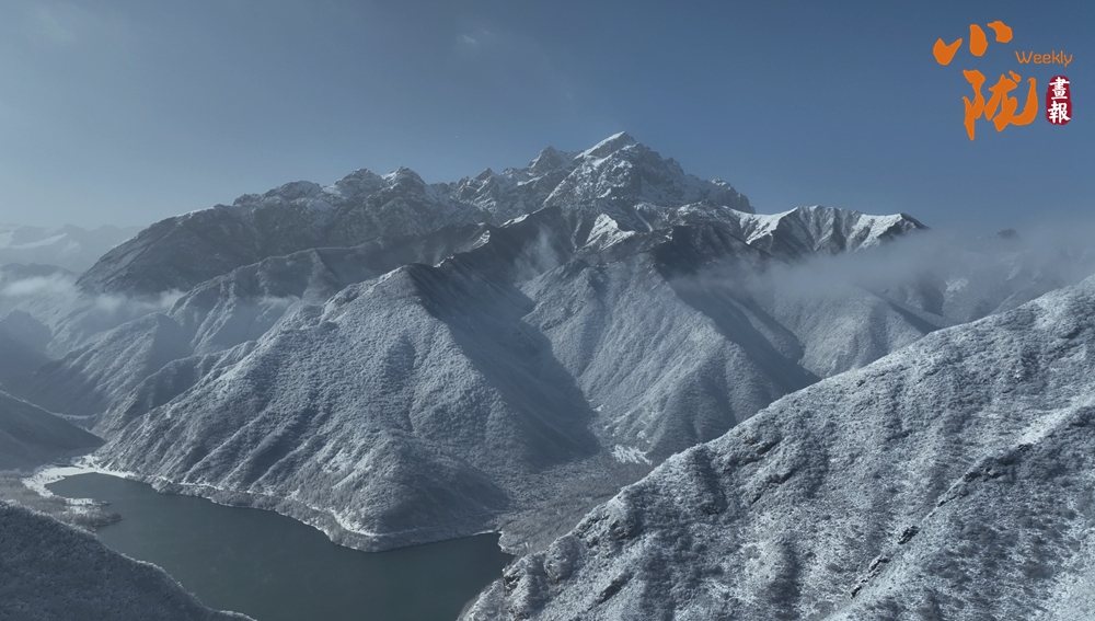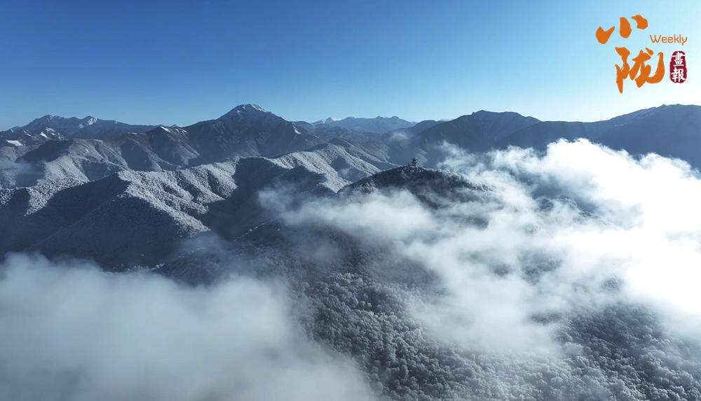 云霧繚繞中,太子山主峰巍峨壯觀,翠色與白雪交織,綿延起伏的山巒溝壑被銀裝緊緊包裹,閃爍著迷人的光芒。