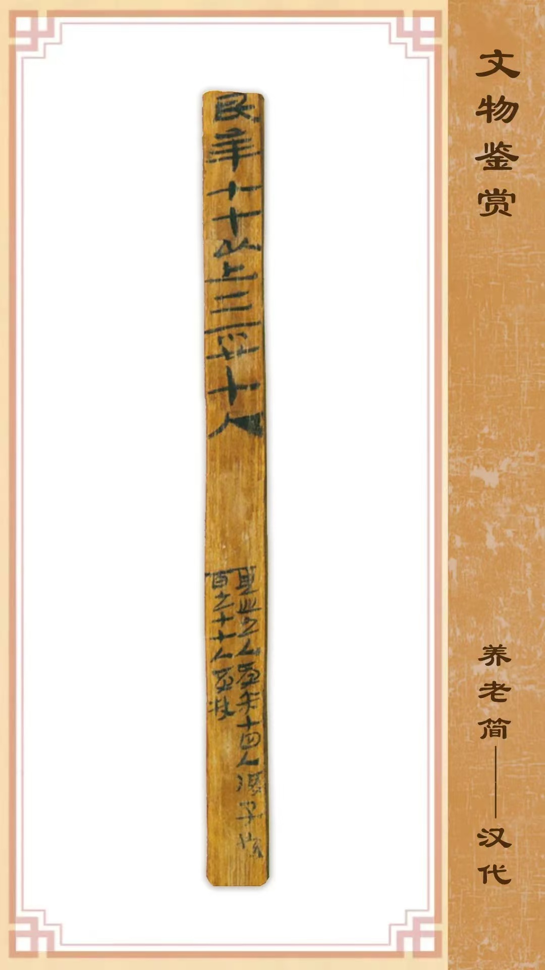 1990年出土于甘肅省敦煌懸泉置遺址,長22.8厘米,寬1厘米,紅柳材質(zhì)。該簡記載分類統(tǒng)計(jì)高年老人享受的待遇,是西漢后期養(yǎng)老制度的反映。