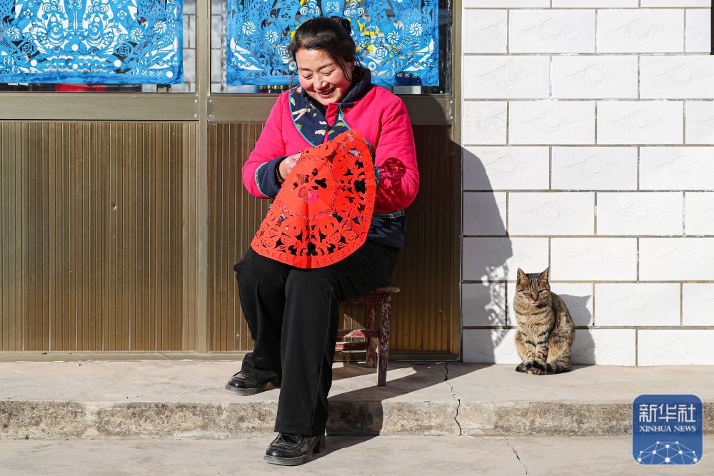 1月5日,在慶陽市合水縣西華池鎮(zhèn)唐旗村,張雪峰創(chuàng)作剪紙作品。