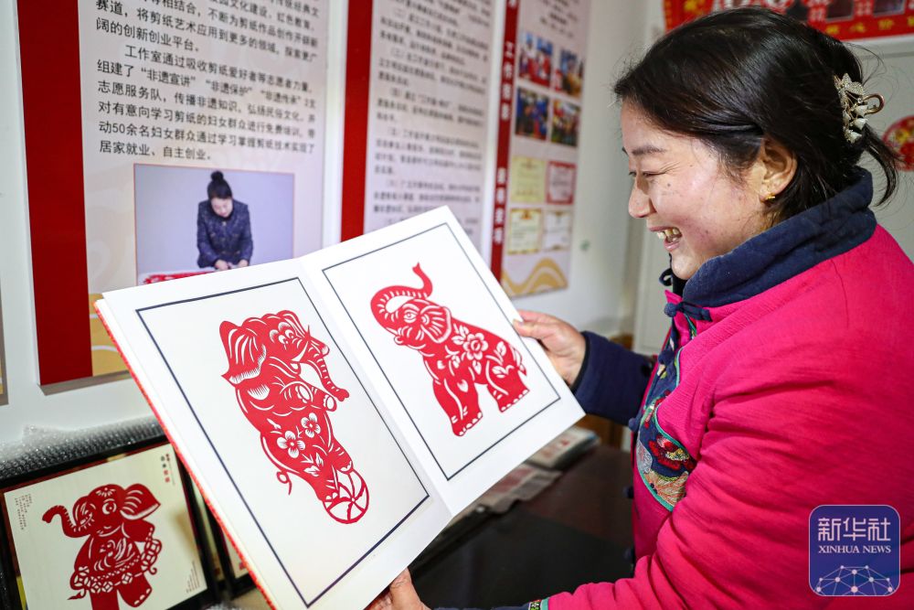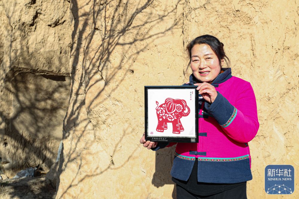 1月5日,在慶陽市合水縣西華池鎮(zhèn)唐旗村,張雪峰展示黃河古象主題剪紙作品。