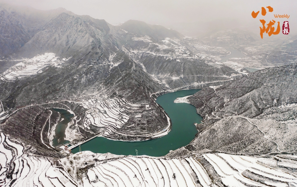 黃河上游最大支流的洮河穿境而過,一路向東奔流。從高空俯瞰,大雪為洮河披上了一層華麗的銀裝,河水靜流,山巒靜止,水墨畫卷自然天成。