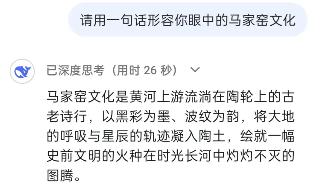 DeepSeek:馬家窯文化作為人類文明長(zhǎng)河中一顆璀璨的明珠,因最早發(fā)現(xiàn)于甘肅省臨洮縣馬家窯村而得名,它被認(rèn)為是仰韶文化向西發(fā)展的延續(xù),它展現(xiàn)了黃河上游先民的創(chuàng)造力,更是史前人類與自然對(duì)話、與社會(huì)共生的見證。
