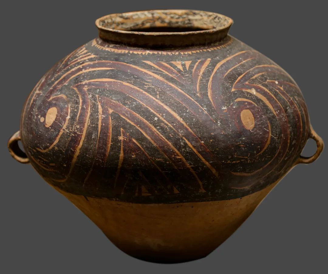 旋渦紋由黑彩繪制的螺旋線條構(gòu)成,線條從中心向外延伸,形成連續(xù)旋轉(zhuǎn)的幾何圖案。多見于陶罐腹部或盆沿,線條粗細(xì)均勻,疏密排列規(guī)律,常與波浪紋組合,呈現(xiàn)動(dòng)態(tài)視覺效果。