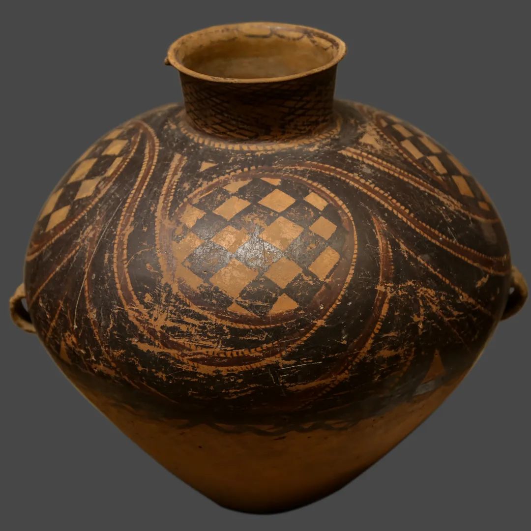 紋飾:以黑彩為主,常見漩渦紋、水波紋、平行線紋、網(wǎng)格紋、同心圓紋等,部分陶器上出現(xiàn)早期人像紋或舞蹈紋。