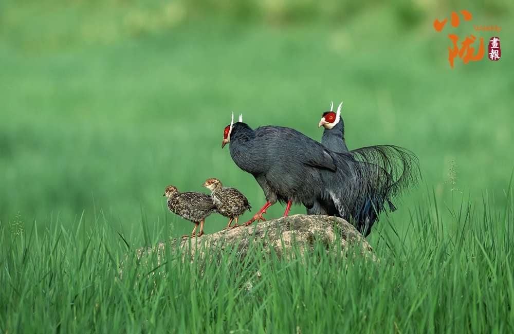 珍貴稀有的國家二級重點保護動物藍(lán)馬雞,體型較大,通體藍(lán)灰色,頸項和肩部顏色更深,閃爍著金屬般的輝亮。其尾羽特別長,由灰藍(lán)色漸變?yōu)榘底纤{(lán)色,并渲染著金屬綠和金屬紫藍(lán)色,24枚尾羽中,中央一對尾羽特別長,富有彈性,彎曲成一個美麗的弧形,高高地翹在其他尾羽之上,披散下垂如馬尾,因而得名。此外,藍(lán)馬雞的頭側(cè)緋紅,耳羽簇白色并突出于頸部頂上,為其增添了獨特的魅力。