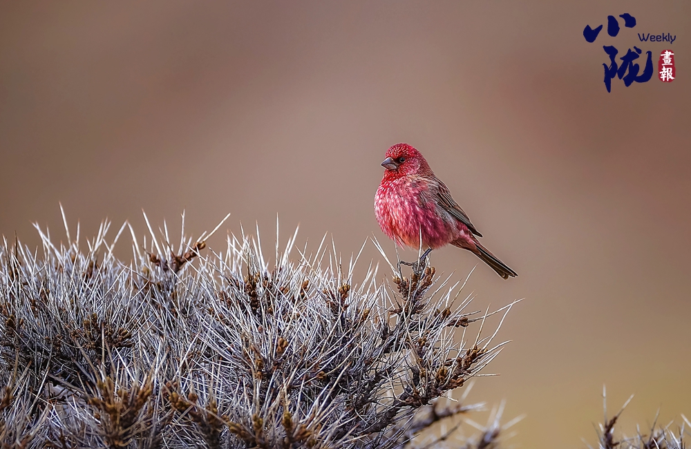 紅眉朱雀,是雀形目燕雀科朱雀屬的鳥類,中等體型,體長約為15厘米。雄鳥的特征是眉紋和臉頰呈淡紫粉色,而上體則有褐色斑駁。雌鳥沒有粉色,難稱“漂亮”,它們?nèi)砘液稚?,?ldquo;朱”一點也不沾邊兒,實際上,很多鳥類的雌鳥都要比雄鳥暗淡很多,這種暗淡的顏色能幫助它們在孵卵的時候更好地隱蔽,以逃過天敵的捕殺。雄鳥和雌鳥都類似于體型較小的曙紅朱雀。