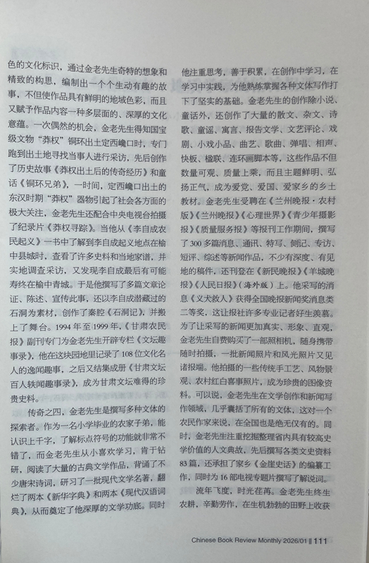 傳奇之四,金老先生是撰寫多種文體的探索者。作為一名小學(xué)畢業(yè)的農(nóng)家子弟,能認(rèn)識上千字,了解標(biāo)點(diǎn)符號的功能就非常不錯了,而金老先生從小喜歡學(xué)習(xí),肯于鉆研,閱讀了大量的古典文學(xué)作品,背誦了不少唐宋詩詞,研習(xí)了一批現(xiàn)代文學(xué)名著,翻爛了兩本《新華字典》和兩本《現(xiàn)代漢語詞典》,從而奠定了他深厚的文學(xué)功底。同時他注重思考,善于積累,在創(chuàng)作中學(xué)習(xí),在學(xué)習(xí)中實(shí)踐,為他熟練掌握各種文體寫作打下了堅(jiān)實(shí)的基礎(chǔ)。金老先生的創(chuàng)作除小說、童話外,還創(chuàng)作了大量的散文、雜文、詩歌、童謠、寓言、報告文學(xué)、文藝評論、戲劇、小戲小品、曲藝、歌曲、彈唱、相聲、快板、楹聯(lián)、連環(huán)畫腳本等,這些作品不但數(shù)量可觀、質(zhì)量上乘,而且主題鮮明、弘揚(yáng)正氣,成為愛黨、愛國、愛家鄉(xiāng)的鄉(xiāng)土教材。金老先生受聘在《蘭州晚報·農(nóng)村版》《蘭州晚報》《心理世界》《青少年攝影報》《質(zhì)量服務(wù)報》等報刊工作期間,撰寫了300多篇消息、通訊、特寫、側(cè)記、專訪、短評、綜述等新聞作品,不少有深度、有見地的稿件,還刊登在《新民晚報》《羊城晚報》《人民日報》(海外版)上。他采寫的消息《義犬救人》獲得全國晚報新聞獎消息類二等獎,這讓報社許多專業(yè)記者好生羨慕。為了讓采寫的新聞更加真實(shí)、形象、直觀,金老先生自費(fèi)購買了一部照相機(jī),隨身攜帶隨時拍攝,一批新聞?wù)掌惋L(fēng)光照片又見諸報端。他拍攝的一些傳統(tǒng)手工藝、風(fēng)物景觀、農(nóng)村紅白喜事照片,成為珍貴的圖像資料。可以說,金老先生在文學(xué)創(chuàng)作和新聞寫作領(lǐng)域,幾乎囊括了所有的文體,這對一個農(nóng)民作家來說,在全國也是絕無僅有的。同時,金老先生注重挖掘整理省內(nèi)具有較高史學(xué)價值的人文典故,先后撰寫各類文史資料83篇,還承擔(dān)了家鄉(xiāng)《金崖史話》的編纂工作,同時為16部電視專題片撰寫了解說詞。