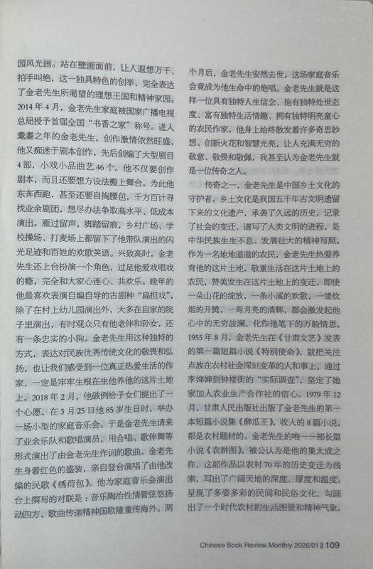 從此之后,我與金老先生的交往越來越密切,交流的話題也越來越廣泛,每次見面,他給我最多的就是鼓勵:“小楊啊,你在《人民日報》上發(fā)表的寫奧運(yùn)會的散文,看得我都激動了。”“小楊啊,《詩刊》上發(fā)表大作了,值得祝賀!”“小楊啊,你的創(chuàng)作達(dá)到了新的水準(zhǔn),都登上國刊《人民文學(xué)》了。”有一次,金老先生得知我在《星星》詩刊舉辦的首屆農(nóng)民工詩歌大獎賽中獲獎的消息后,專門打來電話:“小楊啊,向你表示祝賀,你的獲獎作品表達(dá)了我們農(nóng)民工的心聲!”金老先生與人相處,傳遞的絕對是正能量,從我與他交往的30多年時光里,從來沒有聽到過他非議別人。后來才慢慢發(fā)現(xiàn),他有與眾不同的精神境界、質(zhì)樸品格、為人方式和處事態(tài)度,他靈魂深處永遠(yuǎn)流淌著向善、向上、向真、向美的價值取向,渾身上下始終洋溢著執(zhí)著、豁達(dá)、樂觀、寬容的人格魅力。一個地地道道的農(nóng)民,從當(dāng)年只有小學(xué)文化程度,靠勤奮自學(xué)70年堅(jiān)持筆耕不輟,出版各種作品集25部,共計(jì)400多萬字,被中共甘肅省委、甘肅省人民政府授予“甘肅省文藝終身成就獎”。對一個農(nóng)民來說,這在全國也是屈指可數(shù)的。年近80歲的時候,在患嚴(yán)重眼疾幾乎導(dǎo)致雙目失明的情況下,每天堅(jiān)持寫作兩三千字,用10個月時間,完成了45萬字的長篇小說《農(nóng)耕圖》,榮獲甘肅省文學(xué)藝術(shù)類政府最高獎——敦煌文藝獎,金老先生的頑強(qiáng)毅力和拼命勁頭也是罕見的。20世紀(jì)80年代初,他以家鄉(xiāng)榆中縣金崖鄉(xiāng)文化站為依托,創(chuàng)辦了全省第一個農(nóng)民文學(xué)社——苑川文學(xué)社,舉辦“文學(xué)創(chuàng)作講習(xí)班”,吸引方圓村鎮(zhèn)100多名“泥腿子”文學(xué)愛好者參與其中,每當(dāng)經(jīng)他修改、推薦的作品發(fā)表后,年過半百的他總是騎上自行車跑幾十公里路,喜滋滋地將樣報樣刊送到作者手里,金老先生樂此不疲為文學(xué)愛好者全方位服務(wù)的情懷,在當(dāng)下是不多見的,更加顯得彌足珍貴。興趣廣泛的金老先生在晚年時突發(fā)奇想,在老宅院子里啟動了家庭美化工程,自己設(shè)計(jì)、自己施工,在自家院子西墻上,用五顏六色的小石子創(chuàng)作了一幅長八米、寬二米的巨型壁畫,畫面上有紅日、山水、碌碡、西瓜、樹木、小鹿、大雁、人物,還有太陽灶、飛機(jī)、衛(wèi)星,好一幅天人合一的田園風(fēng)光畫。站在壁畫面前,讓人遐想萬千、拍手叫絕,這一獨(dú)具特色的創(chuàng)舉,完全表達(dá)了金老先生所渴望的理想王國和精神家園。2014年4月,金老先生家庭被國家廣播電視總局授予首屆全國“書香之家”稱號。進(jìn)入耄耋之年的金老先生,創(chuàng)作激情依然旺盛,他又癡迷于劇本創(chuàng)作,先后創(chuàng)編了大型劇目4部,小戲小品曲藝46個。他不僅要創(chuàng)作劇本,而且還要想方設(shè)法搬上舞臺。為此他東奔西跑,甚至還要自掏腰包,千方百計(jì)尋找業(yè)余劇團(tuán),想盡辦法爭取高水平、低成本演出。雁過留聲,腳踏留痕,鄉(xiāng)村廣場、學(xué)校操場、打麥場上都留下了他帶隊(duì)演出的閃光足跡和百姓的歡歌笑語。興致高時,金老先生還上臺扮演一個角色,過足他愛戲唱戲的癮,完全和大家心連心、共歡樂。晚年的他最喜歡表演自編自導(dǎo)的古劇種“扁擔(dān)戲”,除了在村上幼兒園演出外,大多在自家的院子里演出,有時觀眾只有他老伴和孫女,還有一條忠實(shí)的小狗。金老先生用這種獨(dú)特的方式,表達(dá)對民族優(yōu)秀傳統(tǒng)文化的敬畏和弘揚(yáng),也讓我們感受到一位真正熱愛生活的作家,一定是牢牢生根在生他養(yǎng)他的這片土地上。2018年2月,他破例給子女們提出了一個心愿,在3月25日他85歲生日時,舉辦一場小型的家庭音樂會。于是金老先生請來了業(yè)余樂隊(duì)和歌唱演員,用合唱、歌伴舞等形式演出了由金老先生作詞的歌曲。金老先生身著紅色的盛裝,親自登臺演唱了由他改編的民歌《繡荷包》。他為家庭音樂會演出臺上撰寫的對聯(lián)是:音樂陶冶性情管弦悠揚(yáng)動四方,歌曲傳遞精神國歌隆重傳海外。兩個月后,金老先生安然去世,這場家庭音樂會竟成為他生命中的絕唱。金老先生就是這樣一位具有獨(dú)特人生信念、抱有獨(dú)特處世態(tài)度、富有獨(dú)特生活情趣、擁有獨(dú)特明亮童心的農(nóng)民作家,他身上始終散發(fā)著許多奇思妙想、創(chuàng)新火花和智慧光亮,讓人充滿無窮的敬意、敬畏和敬佩,我甚至認(rèn)為金老先生就是一位傳奇之人。