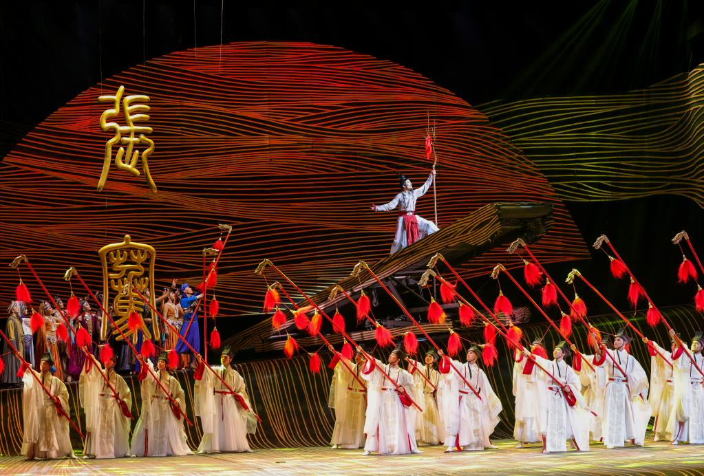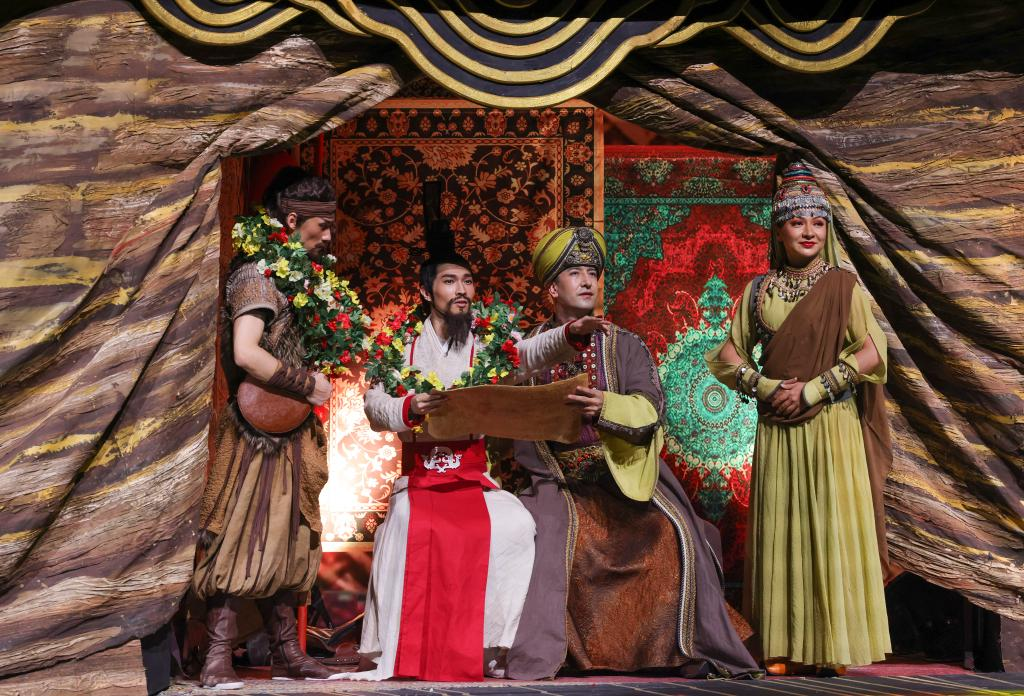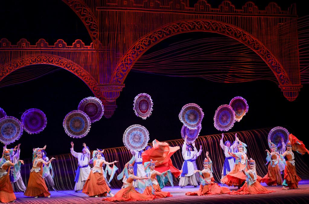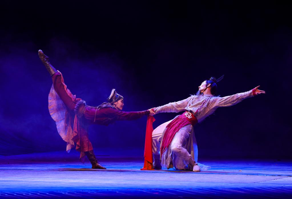 10月27日晚,在烏魯木齊文化中心大劇院,演員在舞劇《張騫》中表演。 10月27日晚,以漢代張騫出使西域為藍(lán)本創(chuàng)作的重大歷史題材舞劇《張騫》,在烏魯木齊文化中心大劇院首演。該劇由《授節(jié)》《守節(jié)》《傳節(jié)》《使節(jié)》四幕組成,演繹了張騫出使西域的“鑿空之旅”,展現(xiàn)了各民族廣泛交往、全面交流、深度交融的生動場景。 新華社記者 王菲 攝